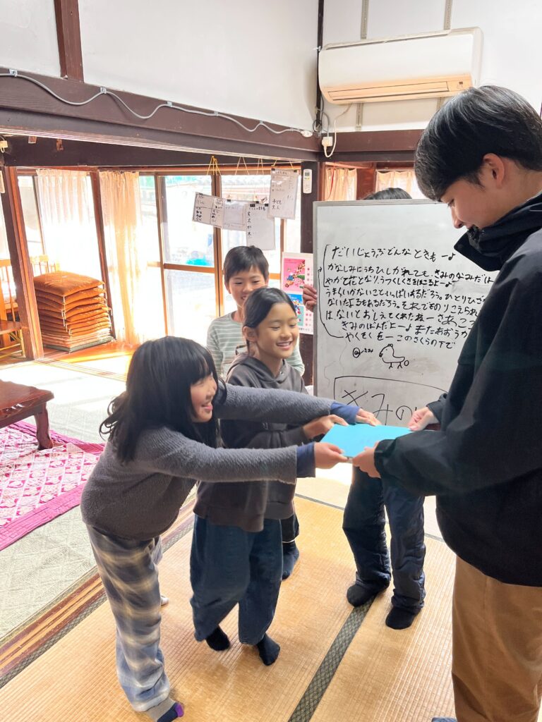 司会進行は子どもたちが担当して、開会式、歌(「君の花」)、ゲーム(かくれ鬼)、それぞれ一言メッセージ、記念写真で締めくくり。