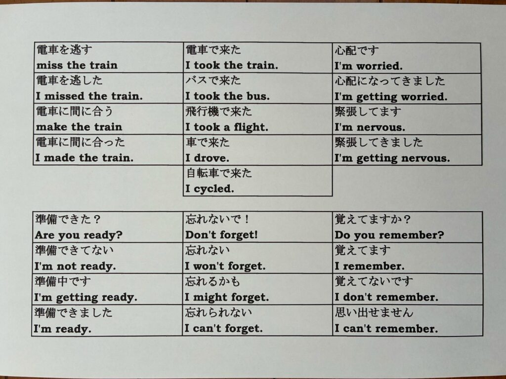 ※別の学習時間では、日常会話の英語表現も整理。「電車に間に合う/間に合わない」といった場面を文にしていく。
